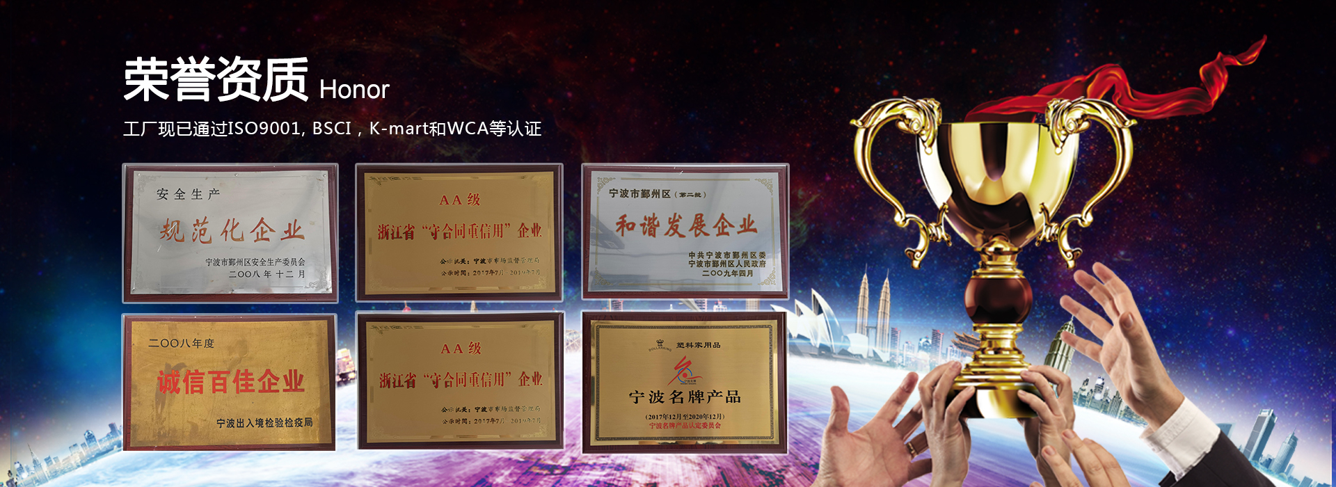 工廠(chǎng)現(xiàn)已通過(guò)ISO9001, BSCI,K-mart和WCA等認(rèn)證。